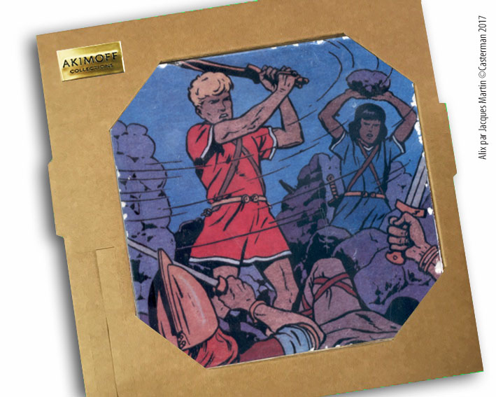 Suivons Alix, jeune esclave d’origine gauloise et son ami Enak en 50 avant J-C. à travers la Gaule pendant un hiver glacial sous le regard de loups affamés. Vont-ils parvenir à déjouer le complot de Pompée pour faire soulever la Gaule et éliminer César grâce à l’épée mythique du grand chef gaulois Brennus ? Les marbres vieillis illustrés par trois plans rapprochés de l’album de Jacques Martin "Les Légions perdues" (1965) nous plongent dans cette histoire aux couleurs si magnifiques. Akimoff ![]() GRAND MARBRE VIEILLI n°40